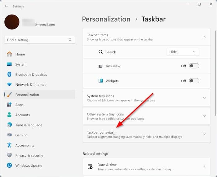 مرحله ۴: در اینجا، روی رفتارهای نوار وظیفه (Taskbar behaviors) کلیک کنید.