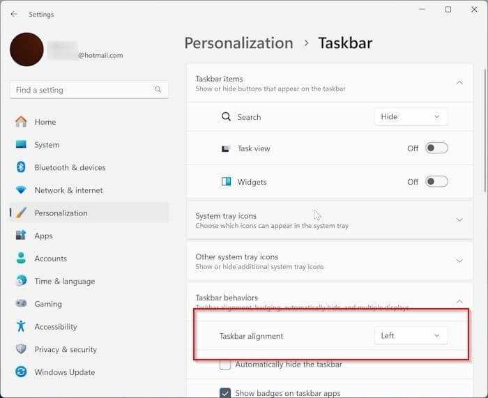 مرحله ۵: در نهایت، از منوی کشویی کنار گزینه « Taskbar alignment » گزینه Left را انتخاب کنید تا ترازبندی نوار وظیفه از مرکز پیشفرض به سمت چپ تغییر کند. همین! از این به بعد، نه تنها آیکونهای برنامهها و دکمه لوگوی ویندوز در سمت چپ نوار وظیفه ظاهر میشوند، بلکه منوی استارت نیز در سمت چپ صفحه نمایش باز خواهد شد.