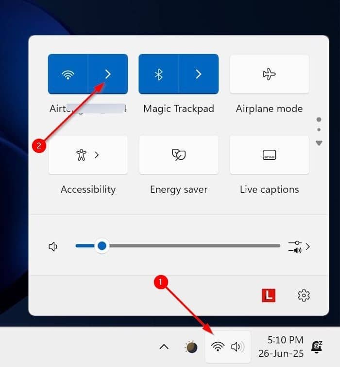 روی آیکون شبکه / Wi-Fi در نوار وظیفه کلیک کنید تا منوی دسترسی سریع باز شود.