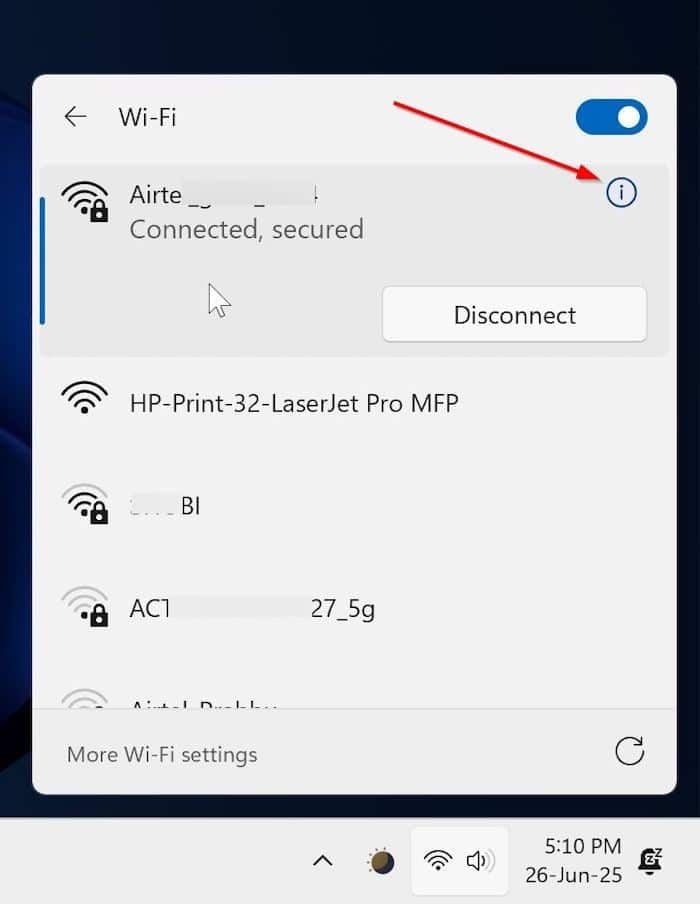 روی دکمهی i کنار شبکهی متصل کلیک کنید تا صفحه مشخصات در تنظیمات باز شود.