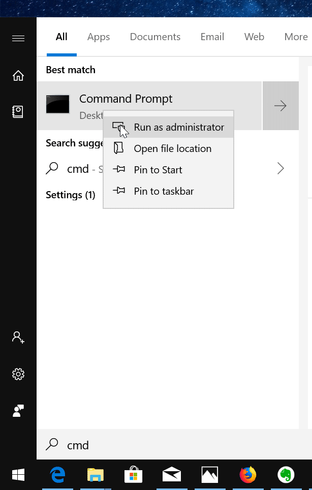 برای این کار، در قسمت جستجوی منوی Start یا نوار وظیفه عبارت CMD را تایپ کرده، روی گزینه Command Prompt راست‌کلیک کنید و سپس گزینه Run as administrator را انتخاب کنید.