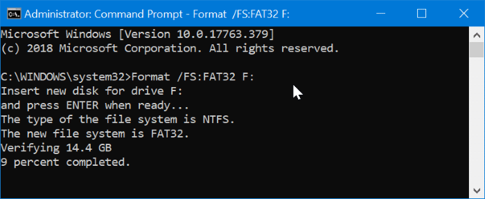 هشدار: تمام داده‌های موجود در فلش مموری حذف خواهند شد. پس از وارد کردن دستور، کلید Enter را فشار دهید تا عملیات فرمت آغاز شود.