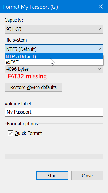 ویندوز 10 و 11 به‌صورت پیش‌فرض اجازه فرمت کردن فلش مموری‌ها یا هاردهای اکسترنال بزرگ‌تر از ۳۲ گیگابایت را با فایل سیستم FAT32 نمی‌دهند. در ابزار فرمت ویندوز، فقط گزینه‌های NTFS و exFAT برای درایوهایی با حجم بالاتر از ۳۲ گیگابایت نمایش داده می‌شود.