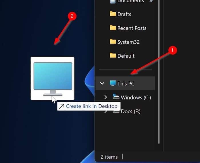 مرحله ۲: پس از اجرای فایل اکسپلورر، ورودی This PC را از پنل ناوبری (پنل سمت چپ) به ناحیه دسکتاپ بکشید و رها کنید تا بلافاصله آیکون میانبر This PC در دسکتاپ ویندوز ۱۱ ایجاد شود.