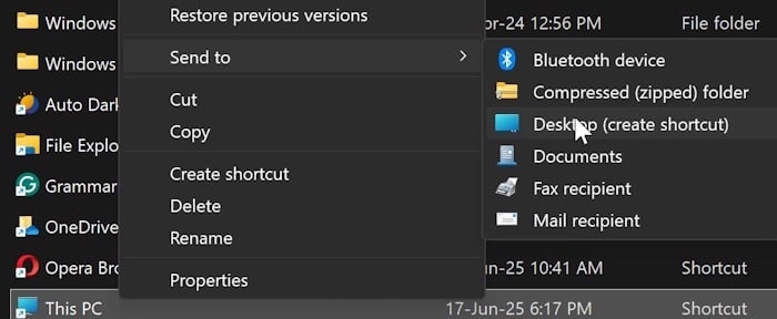 روش دیگر این است که روی آیکون میانبر This PC کلیک راست کنید ، روی Show more options کلیک کنید ، روی Send to کلیک کنید و سپس روی Desktop (ایجاد میانبر) کلیک کنید تا آیکون This PC به دسکتاپ ویندوز ۱۱ اضافه شود.