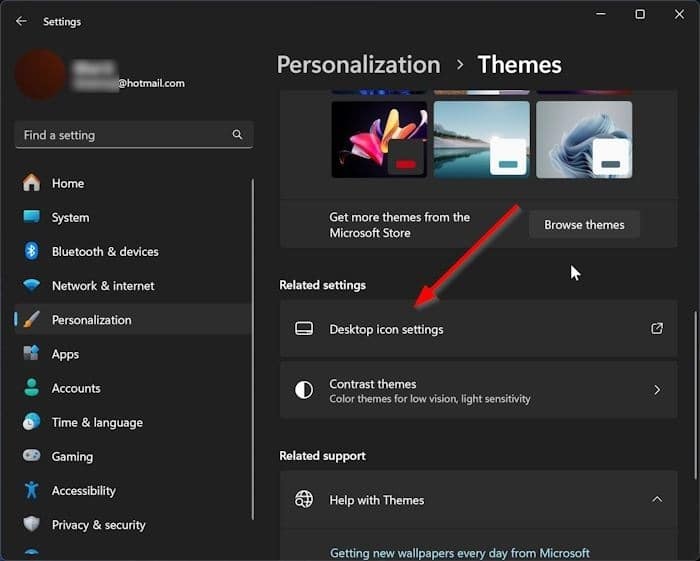 مرحله ۲: به صفحه شخصیسازی > پوستهها بروید . در اینجا، در بخش تنظیمات مرتبط، روی پیوند تنظیمات آیکون دسکتاپ کلیک کنید تا کادر تنظیمات آیکون دسکتاپ باز شود.