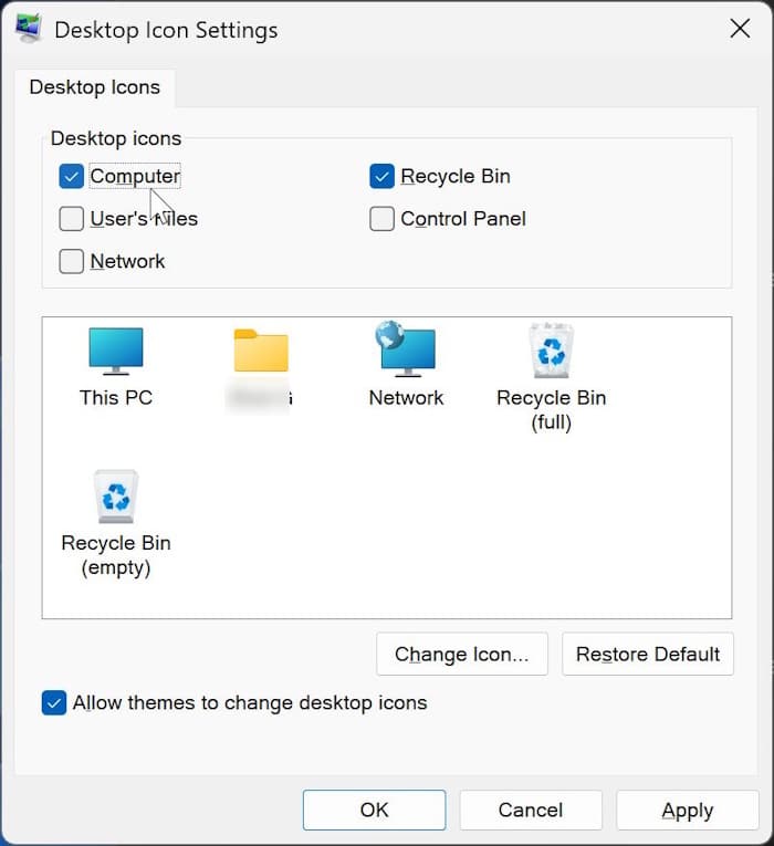 مرحله ۳: انتخاب کامپیوتر کادر را علامت بزنید و سپس روی دکمه اعمال کلیک کنید تا نماد میانبر This PC به دسک تاپ اضافه شود.