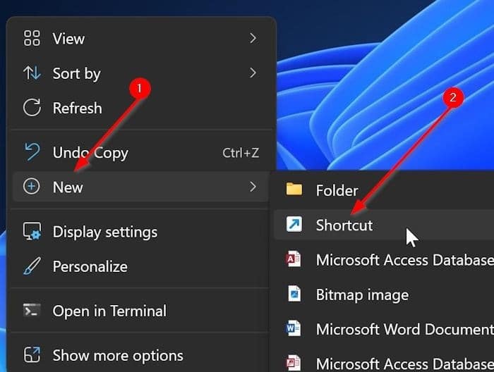 مرحله ۱: روی فضای خالی دسکتاپ کلیک راست کنید ، روی New و سپس روی Shortcut کلیک کنید تا ویزارد Create Shortcut باز شود.