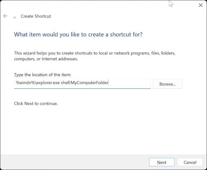 با استفاده از ویزارد New Shortcut در ویندوز ۱۱، میانبر This PC را روی دسکتاپ ایجاد کنید.