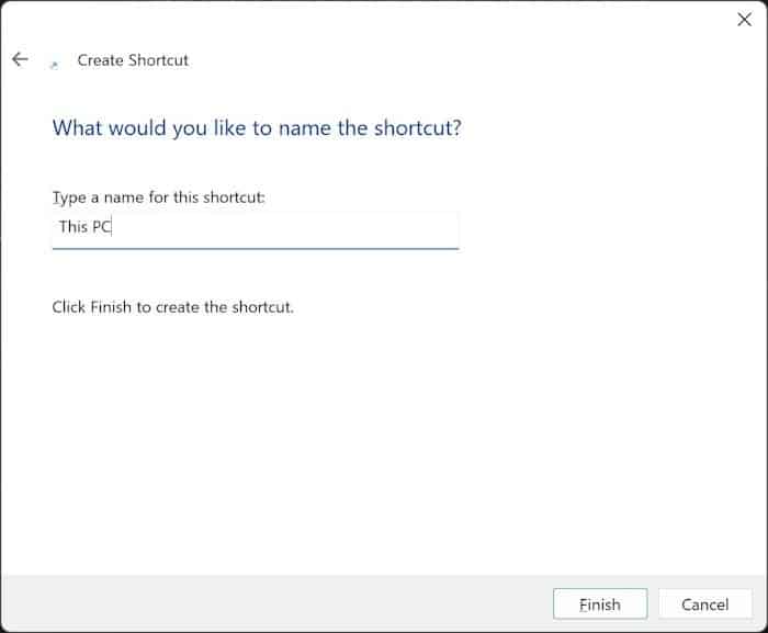 مرحله ۳: در نهایت، قبل از کلیک بر روی دکمه Finish ، عبارت This PC را در فیلد Type a name for this shortcut تایپ کنید تا آیکون میانبر This PC در دسکتاپ ویندوز ۱۱ ایجاد شود.