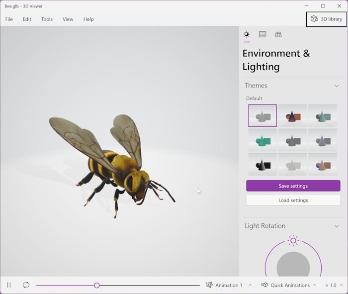 همانطور که از نامش پیداست، برنامهی نمایشگر سهبعدی فقط از مشاهدهی مدلها و انیمیشنهای سهبعدی پشتیبانیشده پشتیبانی میکند. البته، از ایجاد مدلهای سهبعدی پایه نیز پشتیبانی میکند.