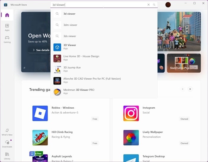 مرحله ۲: در برنامه فروشگاه، عبارت « ۳D Viewer » را در قسمت جستجو تایپ کنید و سپس کلید Enter را فشار دهید تا نتیجه را ببینید.