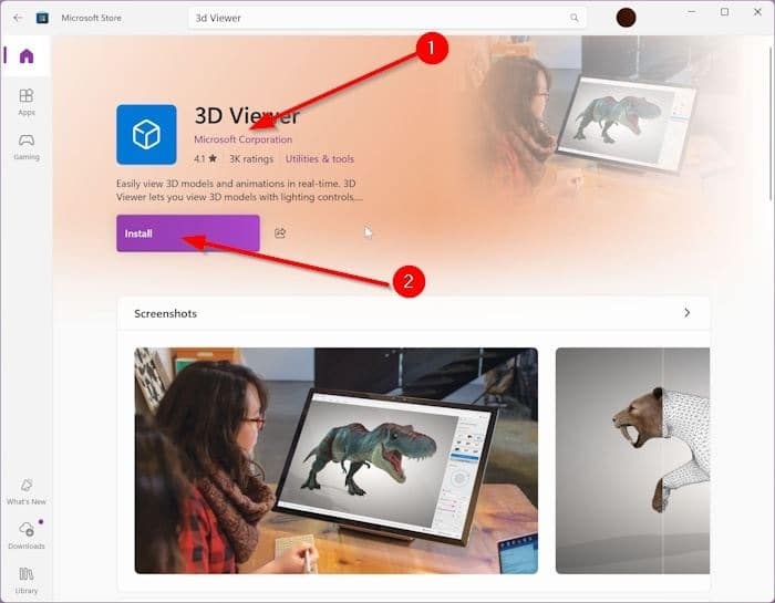 مرحله ۴: در صفحه برنامه نمایشگر سهبعدی، بررسی کنید که آیا عبارت «شرکت مایکروسافت» درست زیر نام برنامه نمایش داده میشود یا خیر تا مطمئن شوید که برنامه رسمی نمایشگر سهبعدی مایکروسافت را نصب میکنید.
