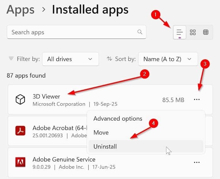 مرحله ۳: با کلیک روی آیکون آن در بالا سمت راست، حالت نمایش را به « نمای فهرستی » تغییر دهید و سپس به دنبال ورودی 3D Viewer در لیست بگردید.