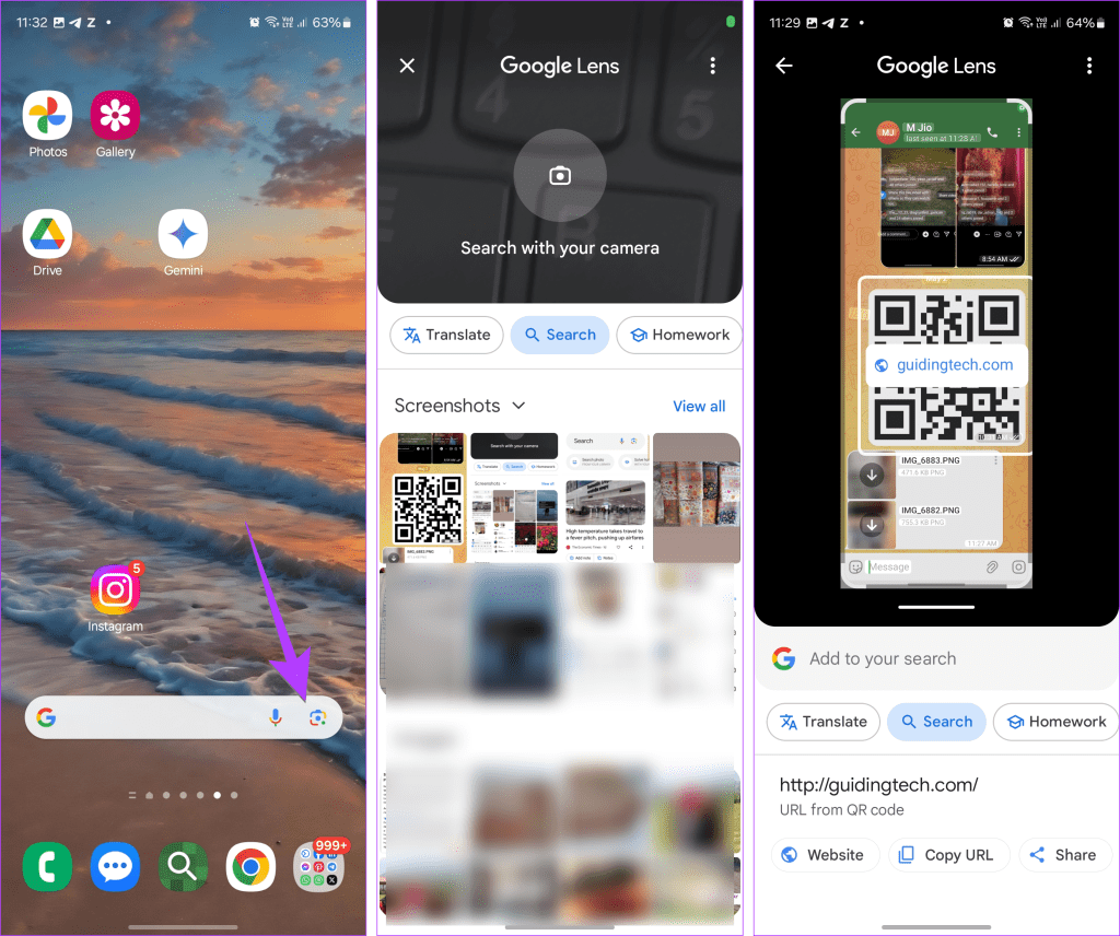 در بسیاری از تلفن‌ها، نماد لنز را در ویجت جستجوی گوگل در صفحه اصلی نیز خواهید یافت. کافیست روی نماد لنز ضربه بزنید و تصویر دارای کد QR را انتخاب کنید. سپس، روی کد QR ضربه بزنید. یاد بگیرید که چگونه ویجت جستجوی گوگل را به صفحه اصلی در آیفون و اندروید اضافه کنید.