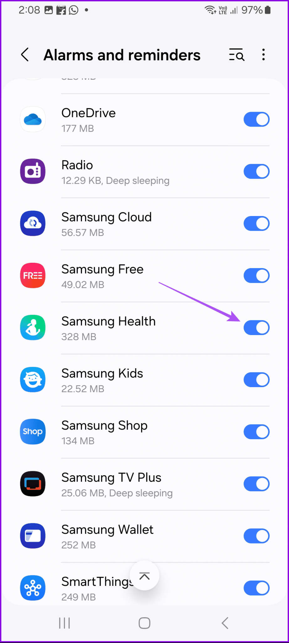 تنظیمات > برنامه‌ها > سه نقطه در گوشه بالا سمت راست > دسترسی ویژه > هشدارها و یادآوری‌ها > فعال کردن مجوز برای برنامه Samsung Health را باز کنید