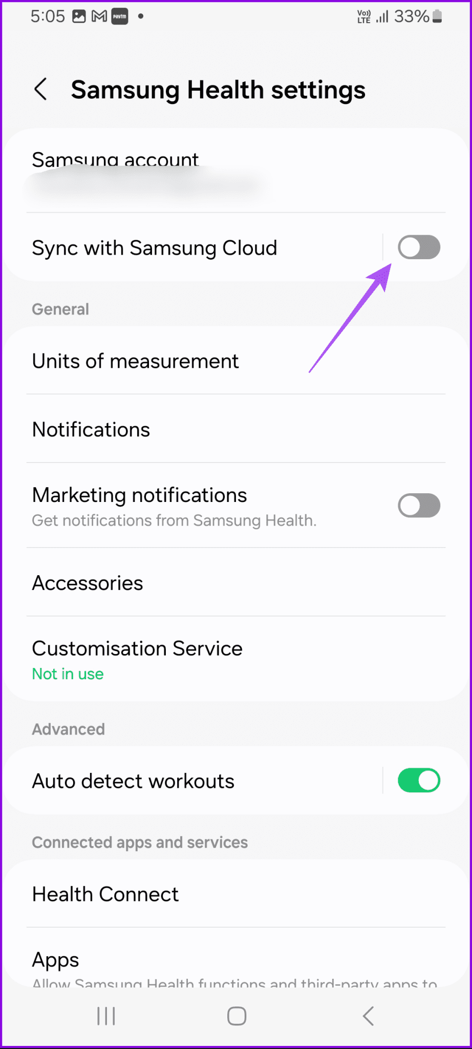 برنامه Samsung Health برای همگام‌سازی تمام داده‌هایتان با دستگاه‌های مختلف، از شما می‌خواهد که با استفاده از حساب کاربری سامسونگ خود وارد سیستم شوید. بنابراین، اگر از یک حساب کاربری در چندین دستگاه سامسونگ استفاده می‌کنید، Samsung Cloud Syncing را در برنامه Samsung Health فعال کنید.