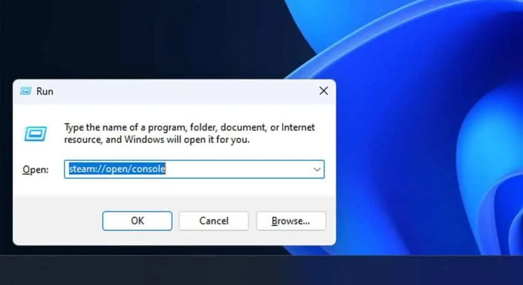 - عبارت زیر را وارد کرده و Enter بزنید (پس از این کار، steam بهصورت خودکار اجرا شده و منوی کنسول را باز میکند.) :
