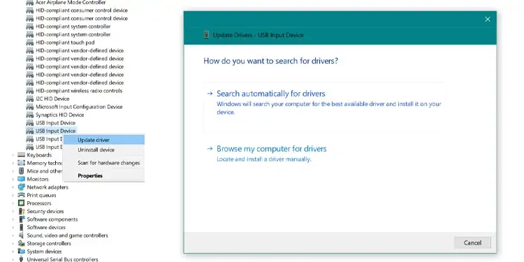 - روی هر گزینه USB Input Device راستکلیک و Update Drivers را انتخاب کنید.