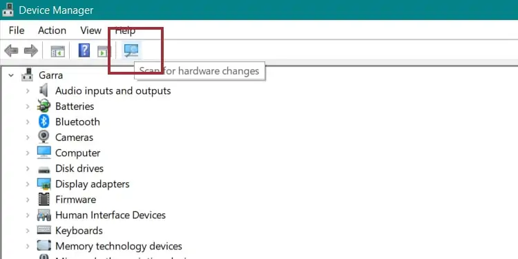 - وی آیکون Scan for Hardware Changes کلیک کنید. ویندوز بهصورت خودکار درایور جدید را نصب خواهد کرد.