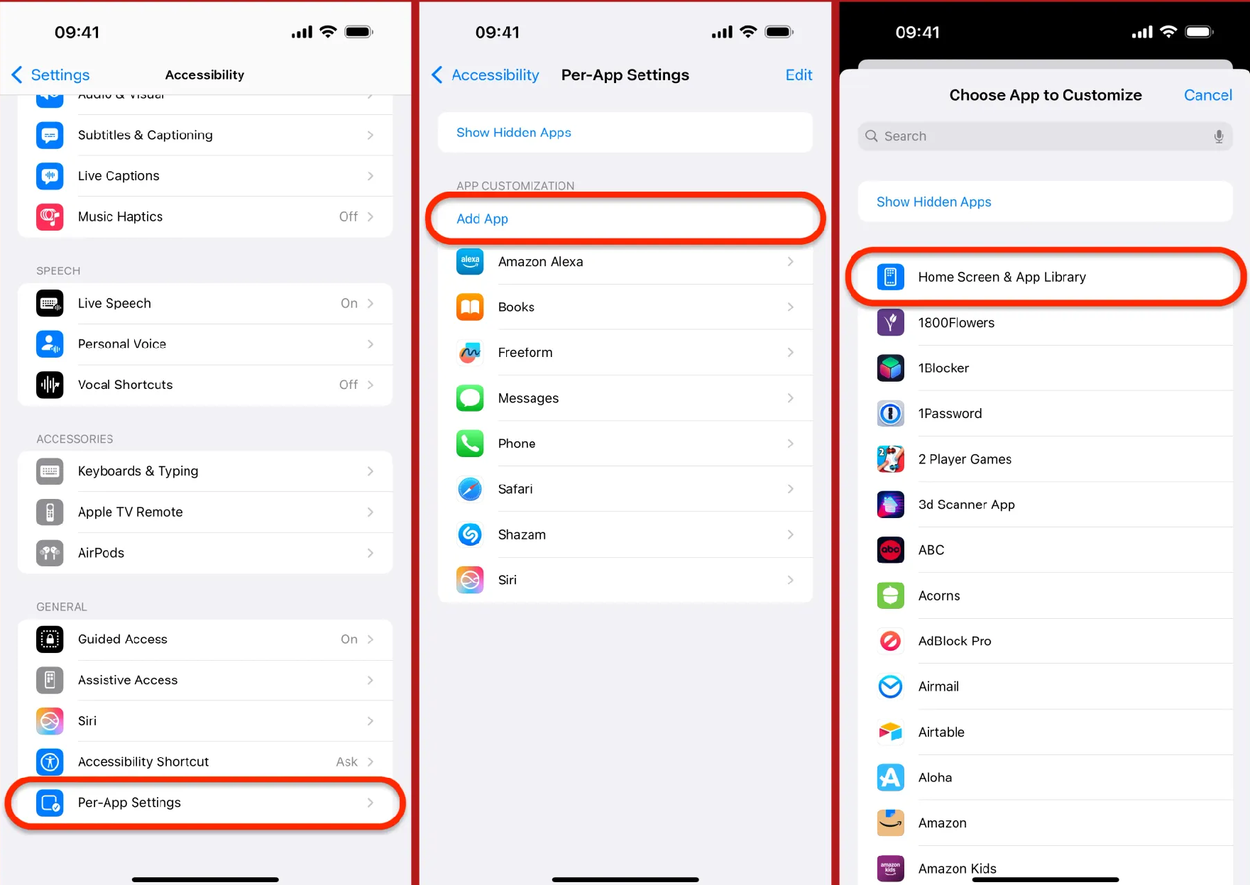 برای اضافهکردن اپها جهت اعمال تنظیمات اختصاصی، در اپ Settings به مسیر Accessibility » Per-App Settings بروید. سپس روی «Add App» بزنید تا فهرست قابلجستوجوی اپها نمایش داده شود؛ فهرستی که شامل اپهای اپل، اپهای شخصثالث و همچنین بخشهای سیستمی مانند Home Screen & App Library و Siri است.
