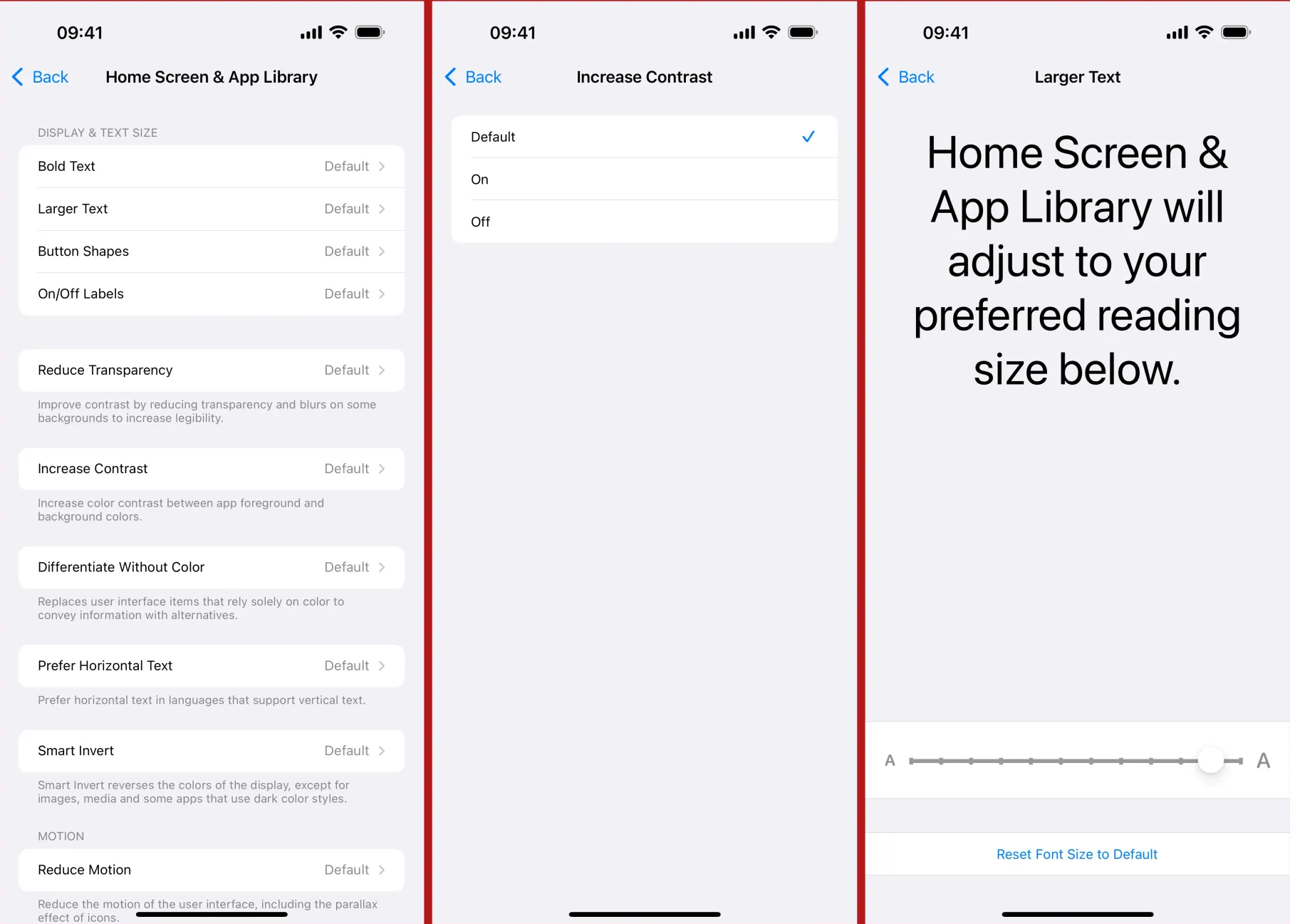 هر گزینه معمولاً دارای انتخابهای Default، On و Off است، بهجز Larger Text که یک اسلایدر دارد و گزینه «Reset Font Size to Default» در آن دیده میشود، و همچنین Auto-Play Animated Images که تنها یک کلید روشن/خاموش دارد.