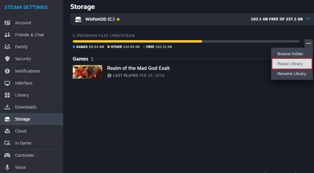 - روی آیکون سهنقطه در کنار درایو اصلی نصب بازیها کلیک کرده و گزینه Repair Library را انتخاب کنید.