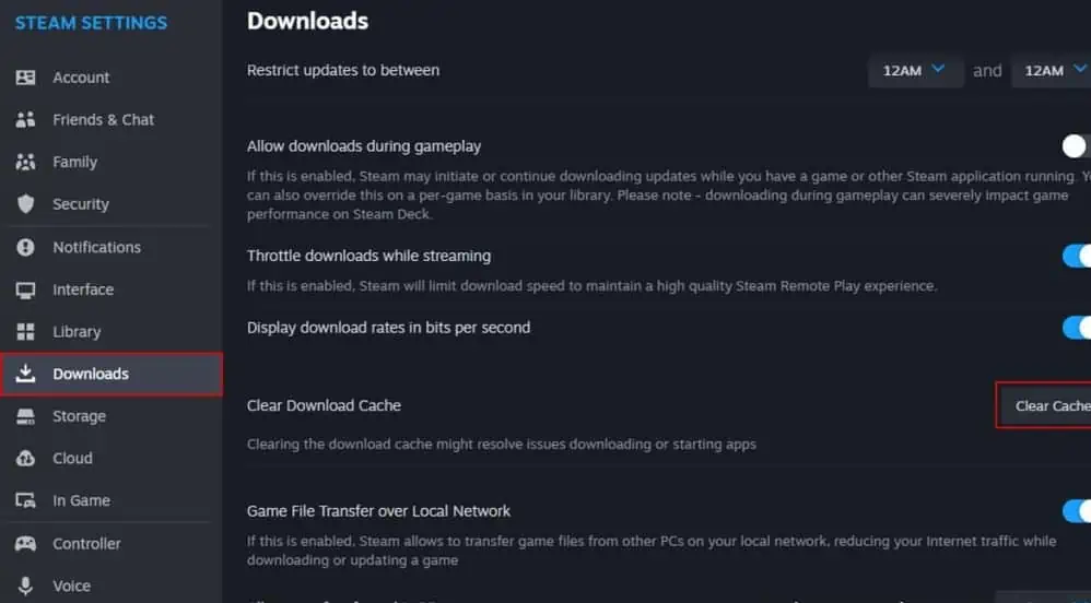 با پاکسازی کش دانلود، Steam فایلهای موقتی مشکلدار را حذف کرده و مسیر دانلود بازیها را دوباره از ابتدا تنظیم میکند؛ این کار معمولاً بسیاری از خطاهای مربوط به دانلود و آپدیت را برطرف میکند.