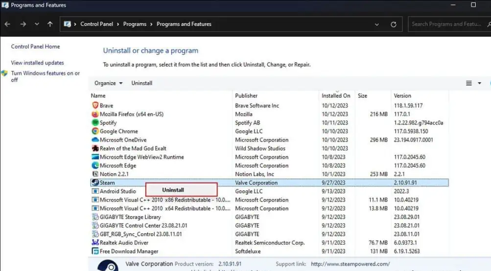 - روی Steam راستکلیک کنید و گزینه Uninstall را بزنید تا برنامه بهطور کامل حذف شود.