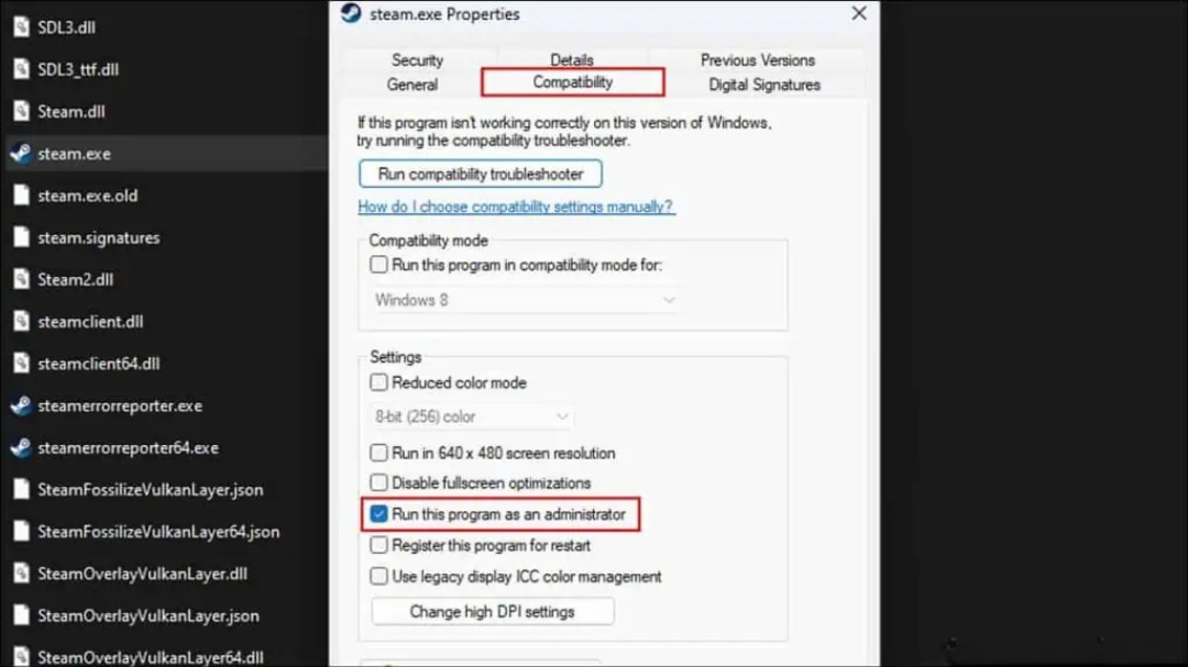 همین تنظیم را برای فایل GameOverlayUI.exe نیز تکرار کنید تا Overlay نیز با دسترسی Administrator اجرا شود.