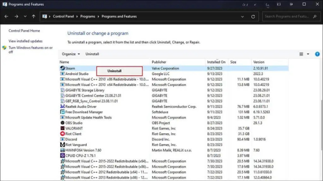 - روی Steam راستکلیک کرده و گزینه Uninstall را انتخاب کنید تا برنامه بهطور کامل حذف شود.