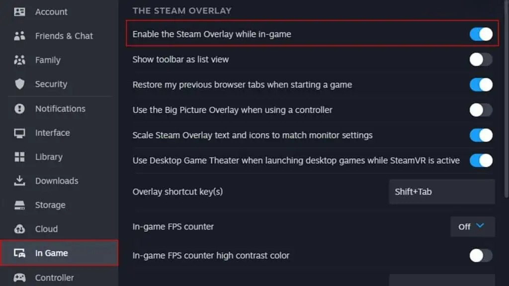 - گزینه Enable the Steam Overlay while In-Game را فعال کنید.
