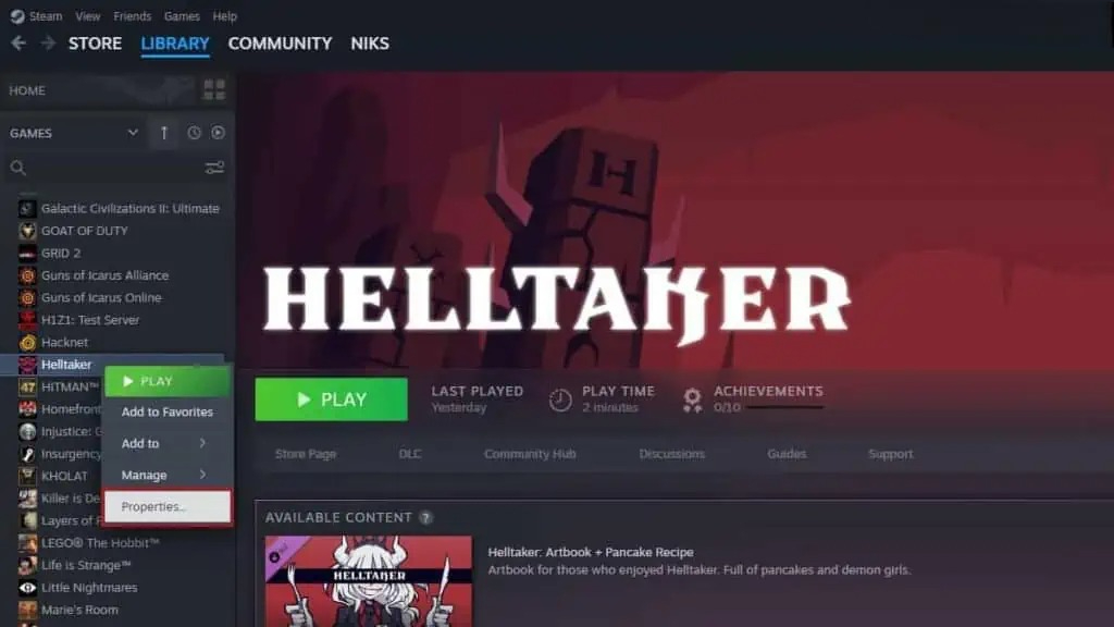 - روی بازی موردنظر راستکلیک کرده و Properties را انتخاب کنید.