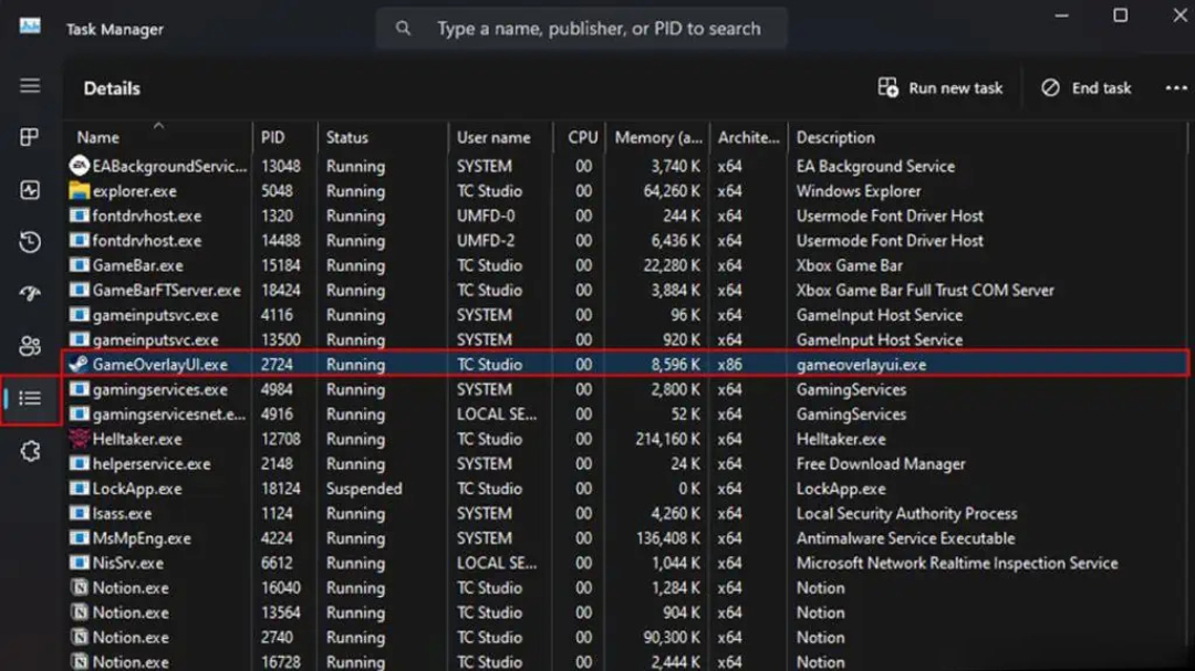 - وارد تب Details شوید و فرآیند GameOverlayUI.exe را پیدا کنید.