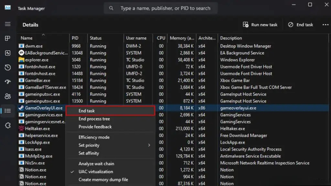 اگر Steam Overlay اصلاً باز نمیشود، احتمال زیادی وجود دارد که فرآیند اجرای Overlay دچار اختلال یا کرش شده باشد. در این حالت، بهترین راهحل این است که فرآیند Overlay را از طریق Task Manager بهصورت کامل ببندید تا Steam آن را دوباره و بدون خطا اجرا کند.