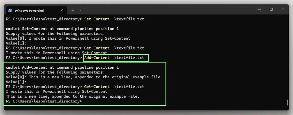 اگر می‌خواهید به یک فایل چیزی اضافه کنید، باید از این دستور استفاده کنید. این دستور همان گردش کار [value0] و [value1] را مانند Set-Content دارد.