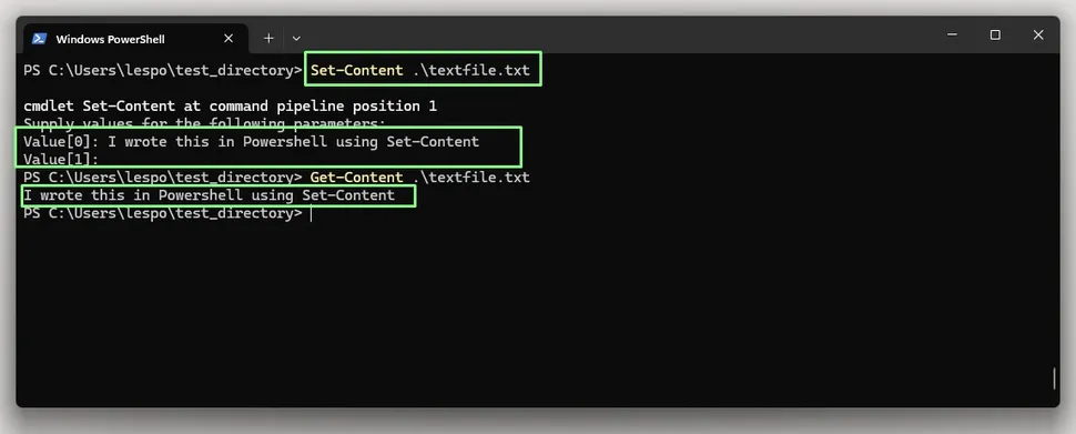 اگر نیاز دارید یا می‌خواهید در PowerShell فایلی ایجاد کنید، می‌توانید از این دستور برای ایجاد یک فایل جدید استفاده کنید. توجه داشته باشید که این دستور به صورت تعاملی از شما می‌خواهد که مقادیر [value0[، [value1] و غیره را وارد کنیدوقتی تمام متن خود را وارد کردید، در یک خط خالی Enter را فشار دهید تا به دستور اعلام کنید که کار تمام شده است. این دستور محتوای فایل را بازنویسی می‌کند، بنابراین فقط در فایل‌های جدید یا در صورتی که واقعاً مطمئن هستید از آن استفاده کنید.