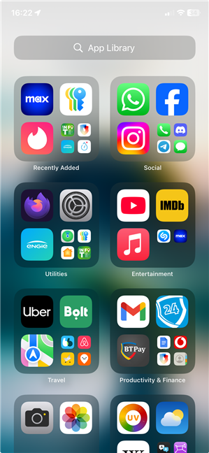 بسته به تعداد صفحات هوم اسکرین که اضافه کرده‌اید، ممکن است لازم باشد چندین بار به سمت چپ بکشید تا به App Library برسید که باید شبیه به تصویر زیر باشد. سه روش برای حذف نصب یک برنامه آیفون با استفاده از App Library وجود دارد