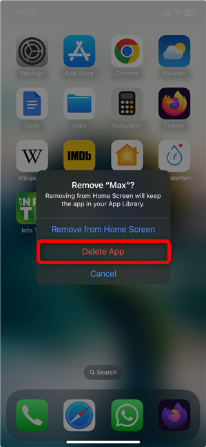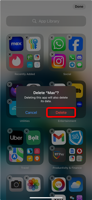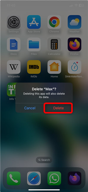 در نهایت، صرف نظر از مسیری که برای حذف برنامه‌های آیفون انتخاب کرده‌اید، در پنجره تأیید، روی حذف (Delete) ضربه بزنید.