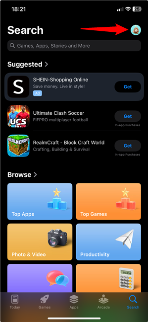 سپس، روی نماد حساب کاربری خود در گوشه بالا سمت راست اپ استور ضربه بزنید.