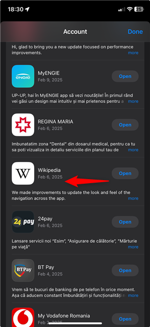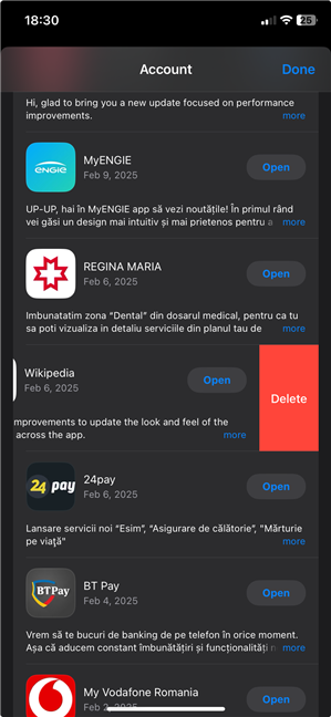 در صفحه حساب کاربری خود، به پایین اسکرول کنید تا لیست برنامه‌هایی که اخیراً به‌روزرسانی شده‌اند را پیدا کنید. همچنین ممکن است لیست دیگری از برنامه‌هایی که به‌روزرسانی‌های خودکار آینده دارند وجود داشته باشد برنامه‌ای را که می‌خواهید حذف کنید در هر دو لیست پیدا کنید و آن را به سمت چپ بکشید.