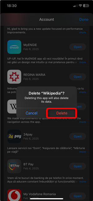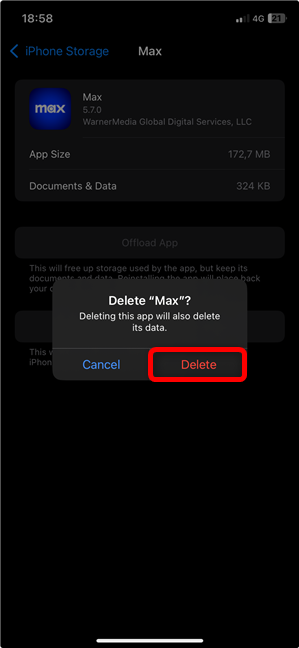 صرف نظر از مسیری که انتخاب می‌کنید، با ضربه زدن روی «حذف»، حذف برنامه و داده‌های آن را از آیفون خود تأیید کنید