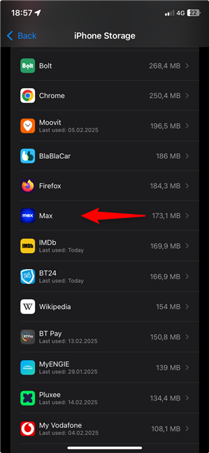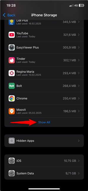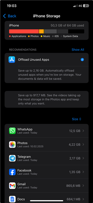 صفحه iPhone Storage نمای کلی از فضای استفاده شده در دستگاه شما را نشان می‌دهد، به دنبال آن چند پیشنهاد و لیستی از برنامه‌های شما که از بزرگترین به کوچکترین مرتب شده‌اند، نمایش داده می‌شود. برای یافتن برنامه‌ای که می‌خواهید حذف کنید، به پایین لیست بروید. در صورت نیاز، روی Show All در پایین لیست ضربه بزنید تا آن را گسترش دهید.