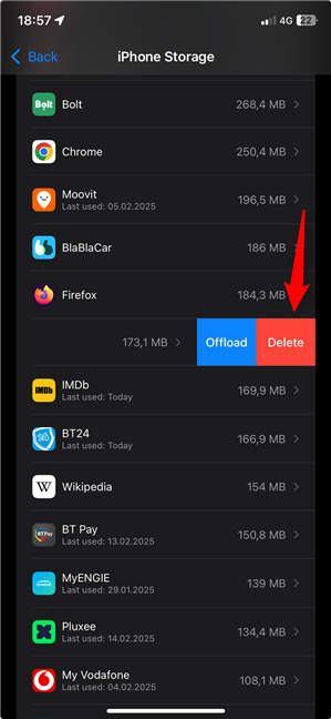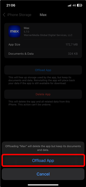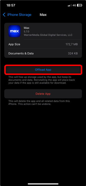 با فشار دادن دکمه‌ی «Offload App» در پایین صفحه، تأیید کنید.