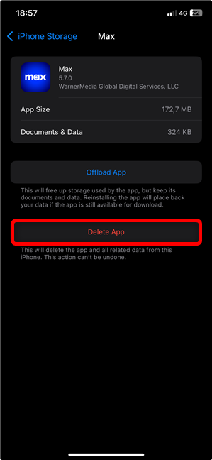 برنامه از آیفون شما حذف نصب شده است. اگر قصد دارید برنامه را در یک مقطع زمانی خاص دوباره نصب کنید، گزینه آبی رنگ Offload یا Offload App را انتخاب کنید. این کار این مزیت را دارد که داده‌ها و اسناد برنامه را برای استفاده بعدی نگه می‌دارد، بنابراین می‌توانید از جایی که آن را رها کرده‌اید، ادامه دهید.