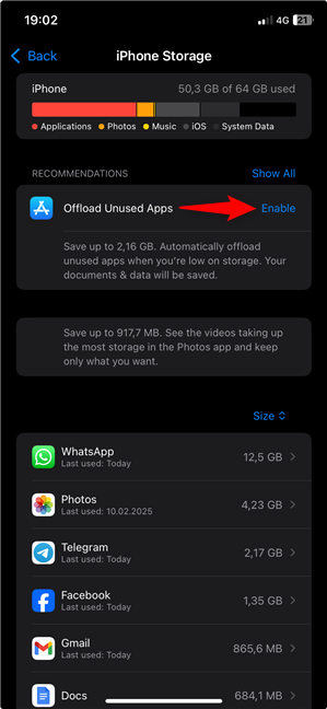 در بخش قبلی نحوه‌ی حذف دستی برنامه‌ها در آیفون را توضیح دادم. با این حال، تنظیماتی وجود دارد که می‌توانید فعال کنید، حذف برنامه‌های استفاده نشده که این کار را به طور خودکار برای شما در هر زمان که فضای ذخیره‌سازی کم است، انجام می‌دهد. تنظیمات را باز کنید، روی عمومی (General) ضربه بزنید و سپس دوباره به فضای ذخیره‌سازی آیفون (iPhone Storage) دسترسی پیدا کنید. در قسمت توصیه‌ها (Recommendations)، گزینه‌ی حذف برنامه‌های استفاده نشده (Offload Unused Apps) را بررسی کنید و روی فعال کردن (Enable) در کنار آن ضربه بزنید.