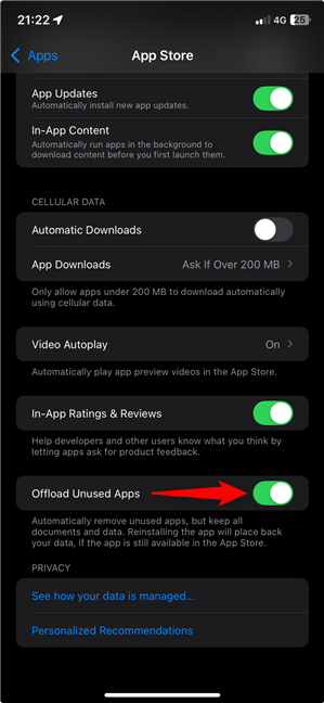 اگر نظرتان عوض شد و خواستید این گزینه را غیرفعال کنید، برنامه تنظیمات (Settings ) را باز کنید و به برنامه‌ها (Apps) > فروشگاه برنامه (App Store) بروید. سپس، به پایین اسکرول کنید و از کلید Offload Unused Apps برای غیرفعال کردن این گزینه استفاده کنید.