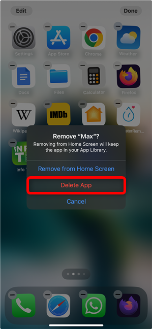 اگر بعد از ظاهر شدن منوی اقدامات سریع، کمی بیشتر روی برنامه فشار دهید، به طور خودکار وارد حالت ویرایش صفحه اصلی می‌شوید. اگر یک فضای خالی را در صفحه اصلی آیفون خود لمس کرده و نگه دارید، همین امر صادق است حالت ویرایش را نمی‌توان از دست داد زیرا همه برنامه‌ها شروع به لرزیدن می‌کنند و یک – (علامت منفی) در گوشه بالا سمت چپ نمایش داده می‌شود. روی – (علامت منفی) کنار برنامه‌ای که می‌خواهید از آیفون خود حذف کنید، ضربه بزنید.