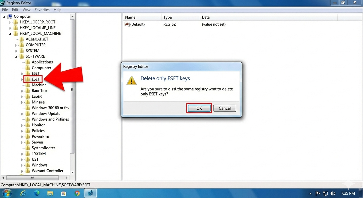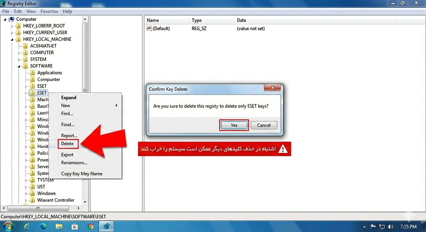 اگر قصد حذف کلیدهای رجیستری را دارید، دقت کنید که فقط کلیدهای مربوط به ESET پاک شوند.