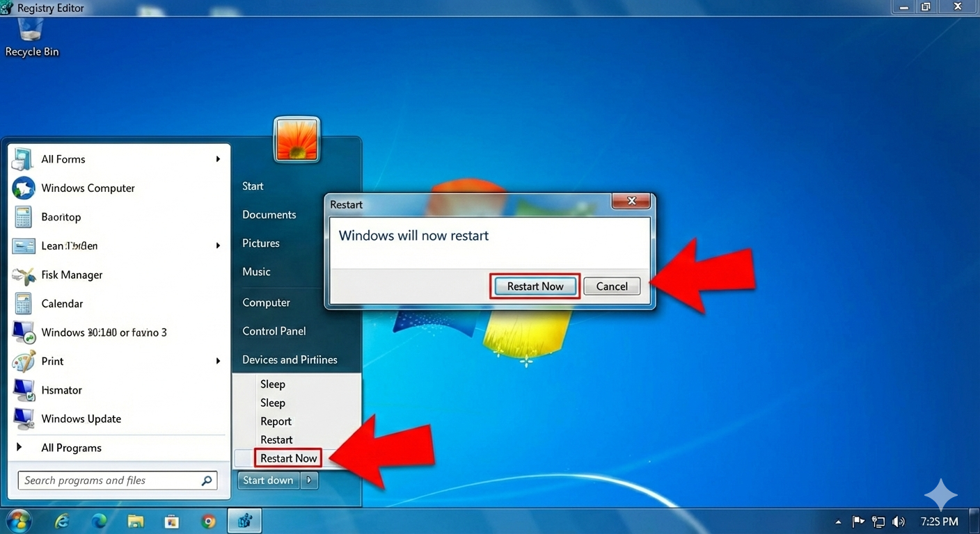 تصویر Windows Restart با فلش قرمز روی Restart Now